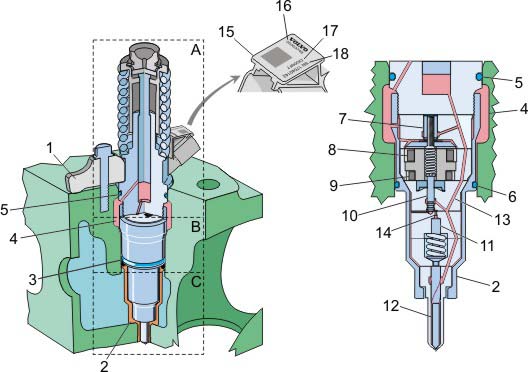 Há três marcações no conector elétrico do injetor (15) — o número da peça (16), o código de regulagem (17) e o número de fabricação (18). Durante a substituição de um ou mais injetores, a unidade de controle eletrônico do motor deve estar programada com o código de regulagem do novo injetor, uma vez que cada injetor é único e o motor é regulado para a injeção de combustível ideal e com menos emissões possíveis. O código de regulagem é programado com a ajuda da seção de programação de parâmetros do VCADS Pro. A programação necessita se realizada somente para o injetor ou injetores específicos que foram substituídos.